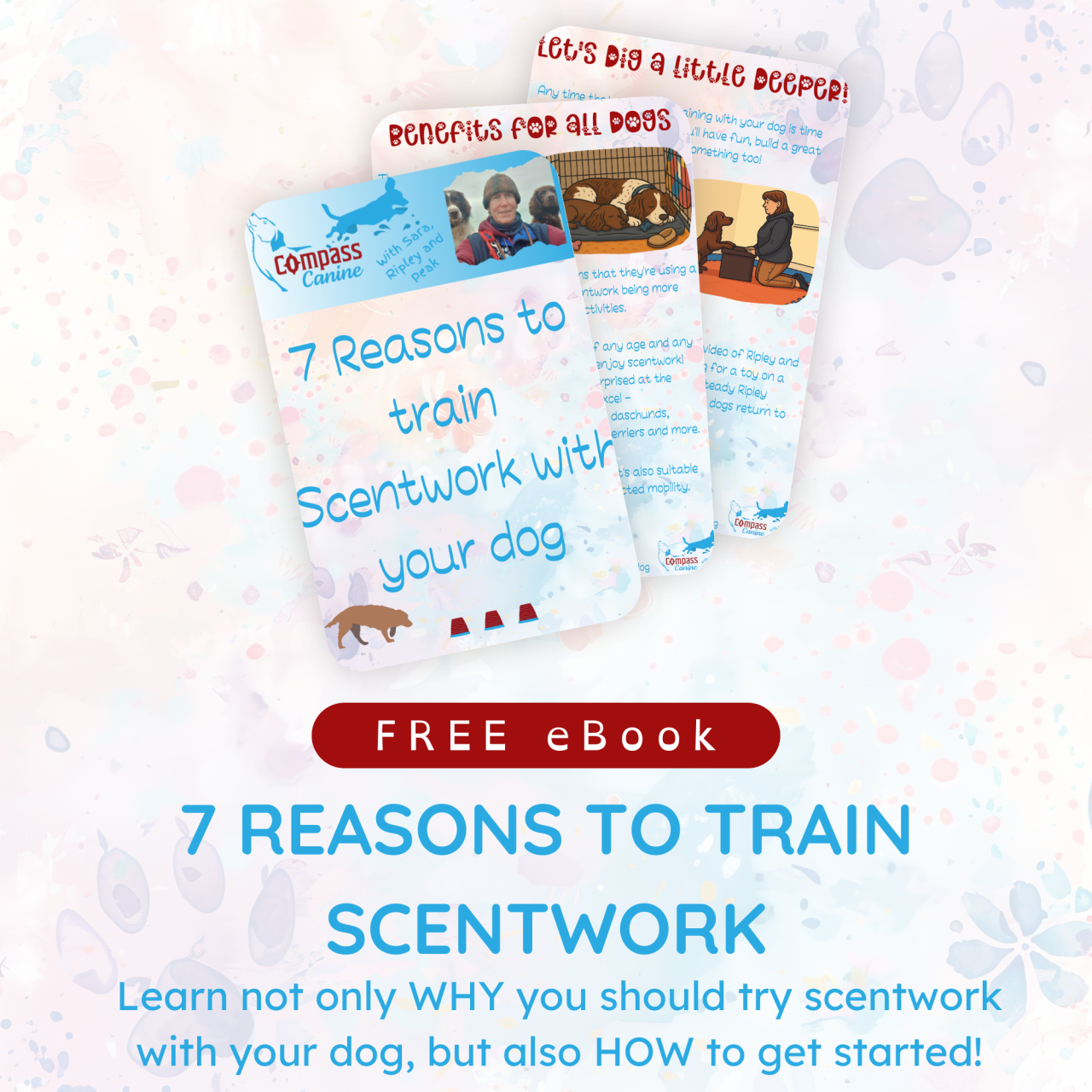 In this FREE eBook I cover just seven great reasons why you should train some form of scentwork with your dog. I'll also share with you some simple things that you can do to get your dog using the AMAZING power of their nose.